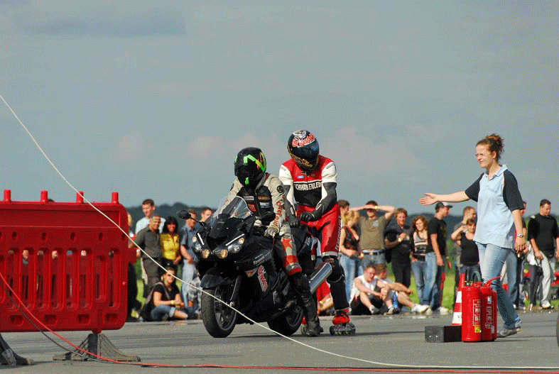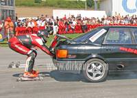 Dabei bewies der Profi-Skater erneut seine fahrerischen Qualitäten indem er sich lediglich mit den Händen am hinteren Bügel des getunten Motorrads festhielt und nicht wie bei seinen Konkurrenten an einer bequemen Armkonstruktion. Dadurch erhöhte sich die Sturzgefahr gegenüber seinen Mitstreitern um ein Vielfaches! Dirk Auer kontrollierte auf seinen verlängerten Inlineskates die extremen Beschleunigungs- und Bremskräfte mit perfekter Körperbeherrschung und maximalen Krafteinsatz. Den 10.000 Zuschauern gefror während der Rekordfahrt das Blut in den Adern.